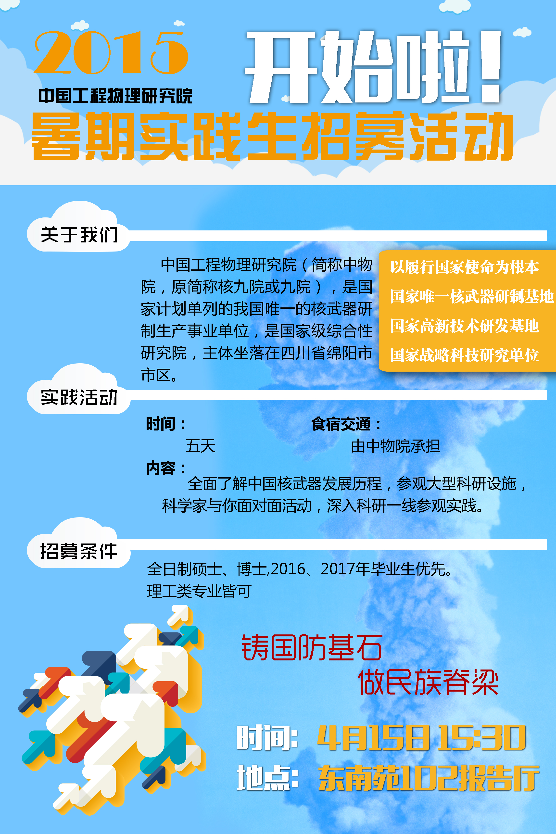 传说中的九院,我国唯一he武器研发、生产单位,今年又来我校开展暑期实习招聘了!而且食宿、交通全免费有木有!时间:4月15日,下午3点半地点:四牌楼校区东南院102针对群体:理工科硕士、博士(2016届、2017届)