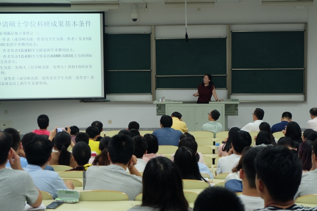 随后,孙蓓蓓院长做了关于机械工程学院研究生培养的简要介绍,主要围绕学籍与管理、培养工作和学位工作三个方面,并着重介绍了管理流程、奖助学金、研究生的课程组成、论文要求及时间节点以及学位授予等工作。