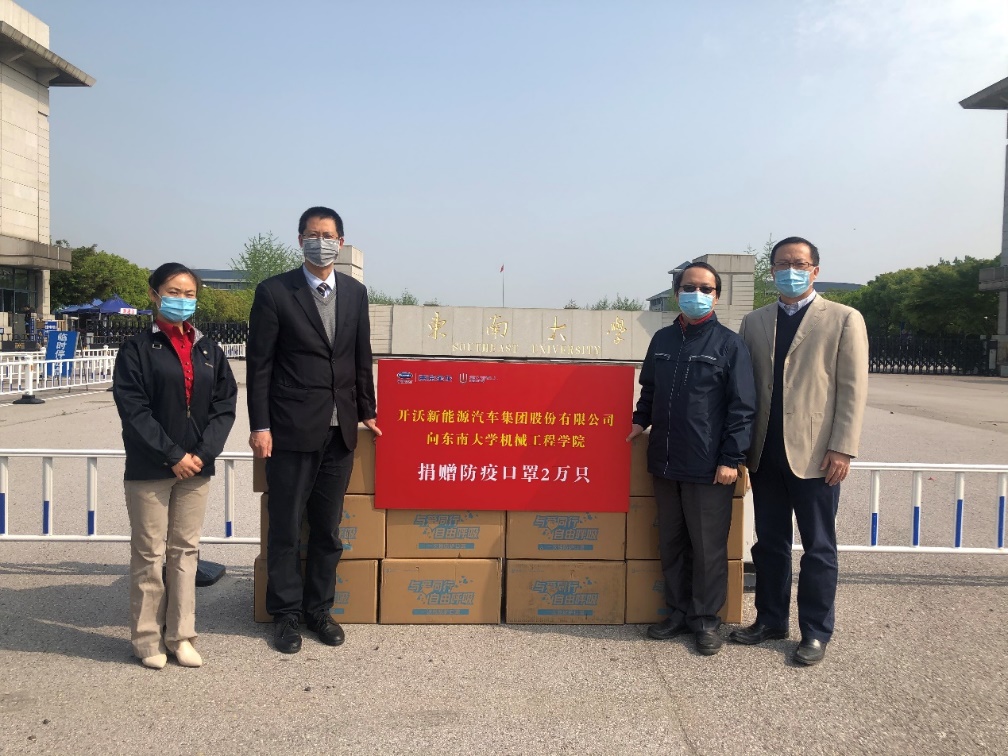 4月21日上午,开沃新能源汽车集团股份有限公司在东南大学九龙湖校区举行捐赠交接仪式,向米兰体育线上平台捐赠2万只口罩,用于学院师生返校后校园内的个人卫生防护,助力学校开学复学。开沃新能源汽车集团股份有限公司人力资源部总监乔达、人力资源部业务经理杨艳丽和米兰体育线上平台党委书记张志胜教授、机械工程学院副院长殷国栋教授作为双方代表参加了交接仪式。