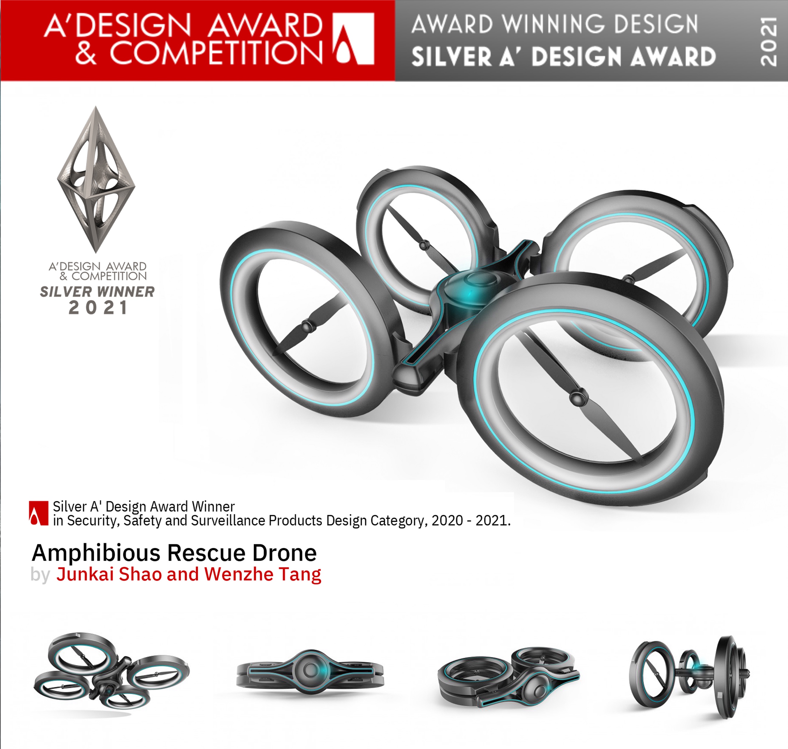 近日,全球设计界备受瞩目的A' Design Award 2021设计大奖揭晓,由米兰体育线上平台工业设计专业17级博士生邵俊凯、18级博士汤文哲设计,薛澄岐教授指导的作品“Amphibious Rescue Drone”,从全球108个国家和地区的20000多份参赛作品中脱颖而出,经过211位具有国际影响力的知名学者、著名媒体成员、创意设计专业人士和有丰富经验的企业家组成的评审团严格评审,斩获“2021 A' Design Award银奖”。