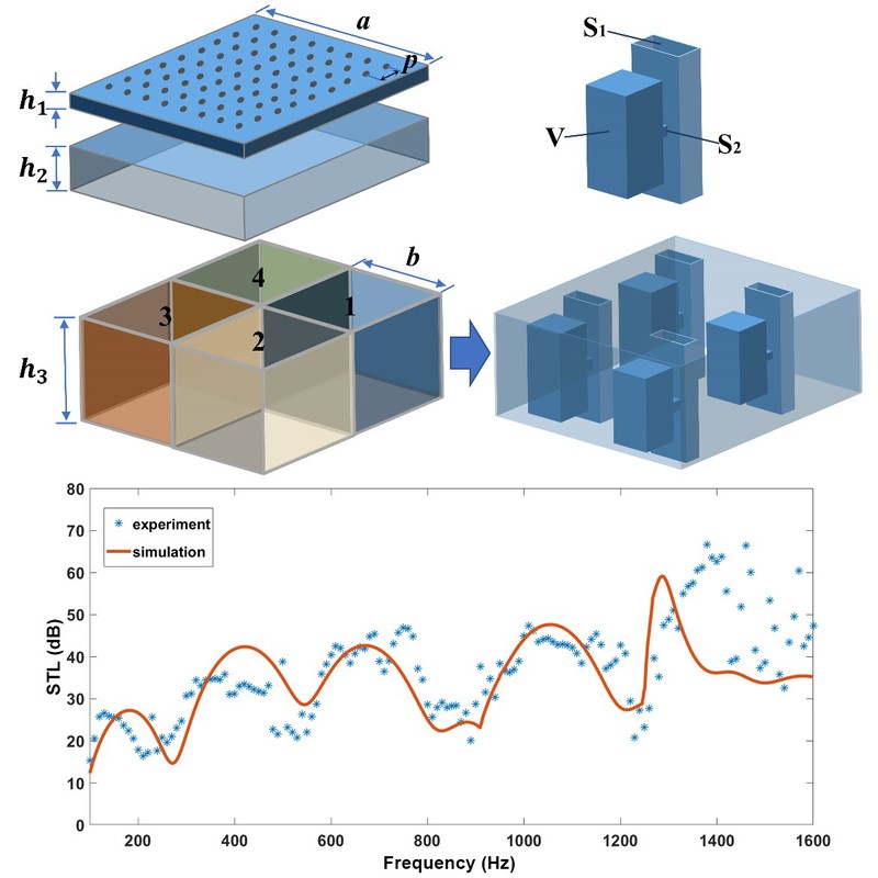 近日,米兰体育线上平台张辉教授团队和法国国家科学院Badreddine Assouar教授团队合作提出一种超薄的基于声超表面的宽带低频消声器。该工作首次提出利用微穿孔板耦合多种参数的复合波导,通过耦合共振实现低频超宽带通风型隔声。在100-1600Hz四个倍频程范围内实现了高于20dB隔声量的隔声。而整个3-D打印的超表面样品的厚度只有6.2cm,对应于最大工作波长的1/55。结构的设计可通过电力声类比的等效电路模型进行理论分析,通过对比不同的结构参数,如穿孔板孔径、中间层的厚度,最终得到优化的隔声曲线。该设计在隔声效率、带宽、通风性和样品厚度四方面具有良好的表现。该工作极大地促进了在满足通风的前提下,声超表面在低频宽带隔声的应用。该工作在工程领域和实际应用场合具有广泛的应用前景。相关研究工作发表在《Physical Review Applied》上。
