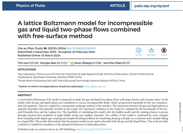 近日,我院2021级硕士研究生刘依琳在格子玻尔兹曼方法多相流建模方面取得新进展,相关研究成果以“A lattice Boltzmann model for incompressible the gas and liquid two-phase flows combined with free-surface method”为题发表在《Physics of Fluids》(流体物理学,PoF)。该期刊创建于1958年,致力于发表原创理论、计算和实验贡献,以了解气体、液体和复杂或多相流体的动力学,是美国物理联合会AIP旗下、中科院分区流体物理领域1区的期刊,最新影响因子4.6