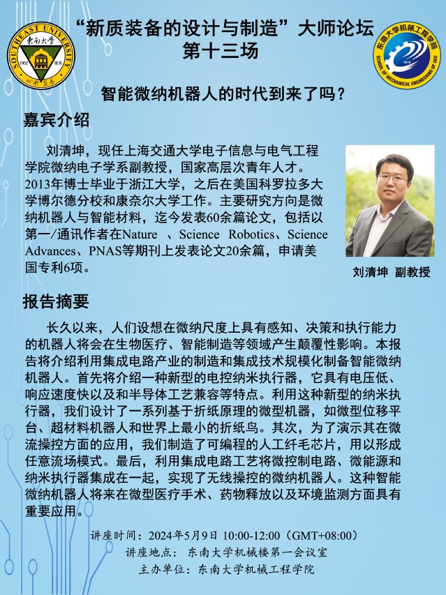 “新质装备的设计与制造”大师论坛 第十三场:刘清坤教授——智能微纳机器人的时代到来了吗