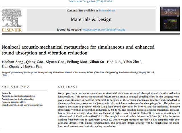 针对上述问题,东南大学张辉教授团队设计了一种基于非局域耦合效应的吸声减振双功能声-力学超表面(NAMM)。NAMM在267 ~ 638 Hz范围内的平均吸声系数大于0.9,在490 ~ 920 Hz范围内的振动级差为18.75 dB,该结构可以应用于航天器、海空装备、轨道交通等设施的减振降噪领域。相关成果以“Nonlocal acoustic-mechanical metasurface for simultaneous and enhanced sound absorption and vibration reduction”为题发表于材料领域TOP期刊《Materials & Design》(https://doi.org/10.1016/j.matdes.2024.113120)。