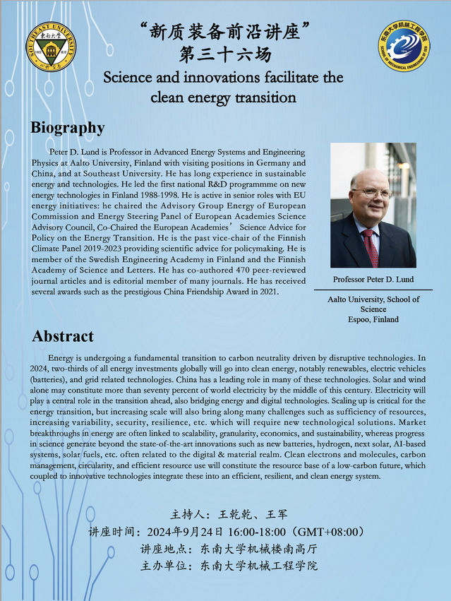 “新质装备前沿讲座” 第三十六场:Professor Peter D. Lund——Science and innovations facilitate the clean energy transition