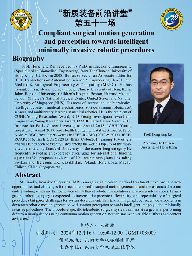 Prof. Hongliang Ren received his Ph.D. in Electronic Engineering (Specialized in Biomedical Engineering) from The Chinese University of Hong Kong (CUHK) in 2008. He has served as an Associate Editor for IEEE Transactions on Automation Science & Engineering (T-ASE) and Medical & Biological Engineering & Computing (MBEC). He has navigated his academic journey through Chinese University of Hong Kong, Johns Hopkins University, Children’s Hospital Boston, Harvard Medical School, Children’s National Medical Center, United States, and National University of Singapore (NUS). His areas of interest include biorobotics, intelligent control, medical mechatronics, soft continuum robots, soft sensors, and multisensory learning in medical robotics. He is the recipient of CUHK Young Researcher Award, NUS Young Investigator Award and Engineering Young Researcher Award, IAMBE Early Career Award 2018, Interstellar Early Career Investigator Award 2018, ICBHI Young Investigator Award 2019, and Health Longevity Catalyst Award 2022 by NAM & RGC, Best Paper Awards in IEEE-ROBIO (2019 & 2013), IEEE-RCAR2016, IEEE-CCECE2015, IEEE-Cyber2014 among 30+ others awards. He has been constantly listed among the world’s top 2% of the most-cited scientists by Stanford University in the career-long category.He frequently served as an expert reviewer/judge for international funding agencies (60+ proposal reviews) of 10+ countries/regions (including Switzerland, Belgium, UK, Kazakhstan, Poland, Hong Kong, Macau, Chilean, China, Singapore etc.