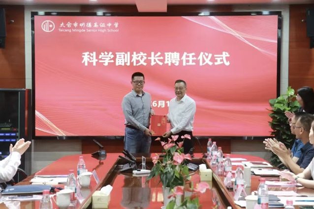 6月13日,太仓市明德高级中学开展科技特色建设专家指导活动。活动现场举行了科学副校长聘任仪式,米兰体育线上平台副院长孙东科教授受聘加盟太仓市明德高级中学科技教育团队,太仓市教育局局长李广耀为孙东科教授颁发科学副校长聘书。
