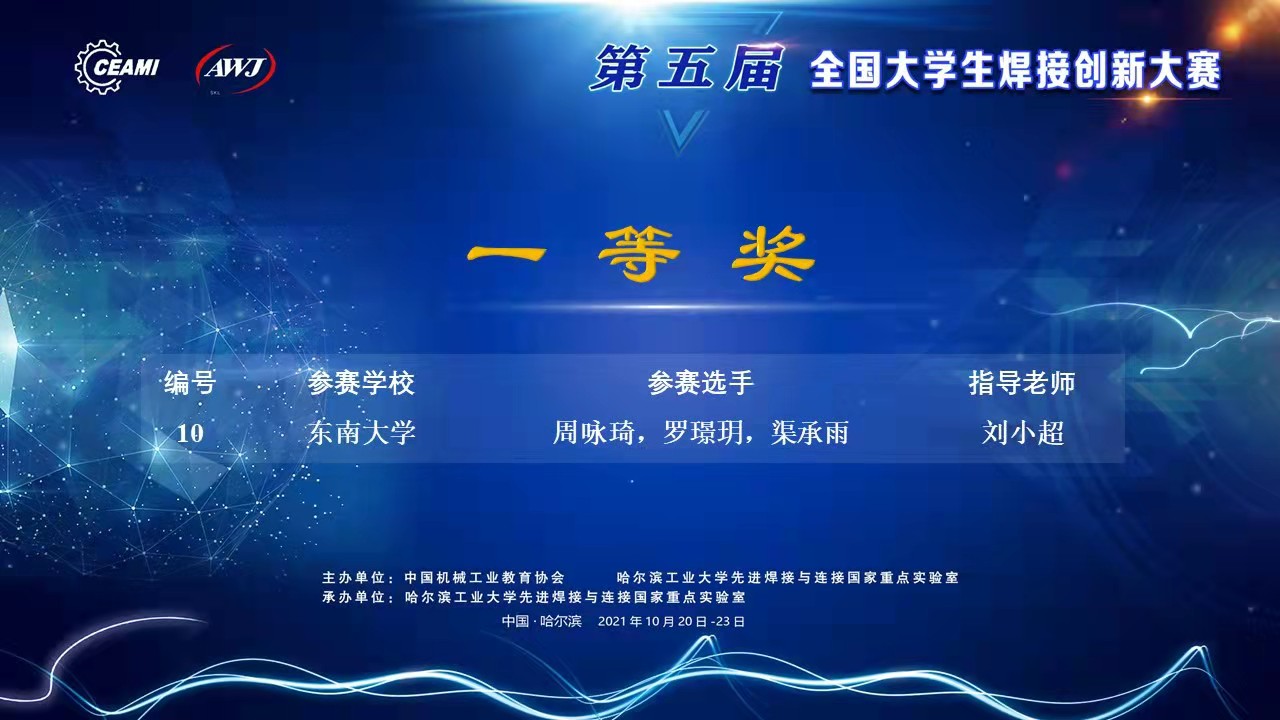 20211020-23日第五届全国大学生焊接创新大赛决赛在哈尔滨工业大学举行,本次大赛共有来自哈尔滨工业大学、清华大学、东南大学、天津大学、西北工业大学、吉林大学、中南大学等62所高校的220件作品参加决赛,我校首次组织队伍参赛,并最终获得一等奖1项、二等奖1项、三等奖2项的优异成绩。