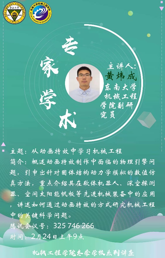 2月24日,东南大学副研究员黄炜成老师为我们机械工程学院全体同学带来了一场生动有趣的讲座。以“从动画特效中学习机械工程”为主题,黄炜成老师首先概述了动画特效制作中面临的物理引擎问题,进一步引申出针对固体结构动力学模拟的数值仿真方法,并重点介绍其在软体机器人、深空探测器、空间太阳能帆板等先进机械装备中的应用,讲述如何通过动画特效的方式研究机械工程中的关键科学问题。最后黄炜成老师给同学们展示了自己在柔性非线力性学方面的一些研究成果,并与同学们一起交流探讨相关问题,使机械工程学院的同学们受益良多。