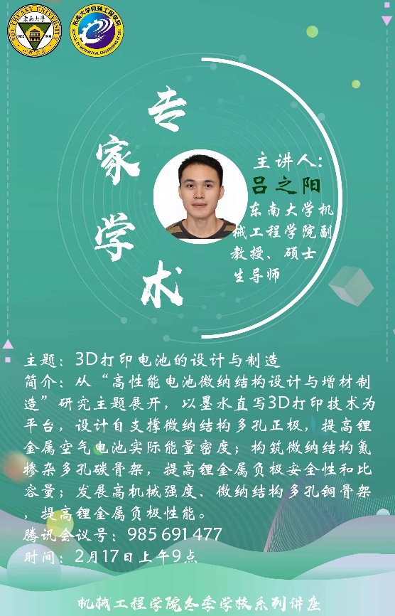 2月17日,米兰体育线上平台副教授吕之阳老师为同学们开展了一场关于3D打印技术的讲座。围绕着3D打印电池的设计与制造这一话题,吕之阳副教授通俗详尽地介绍了增材制造的技术定义,技术特点以及应用领域,并从未来可穿戴设备的发展及智能设备小型化的趋势,对体积更小、容量更大的电池的需求,结合3D打印电池的优越特点,高瞻远瞩地提出了3D打印在电池制造方面研究的必要性。最后,吕之阳副教授展示了自己在电池微纳结构的设计与3D打印构筑的具体成果,并对3D打印电池这一领域做出了积极的展望。