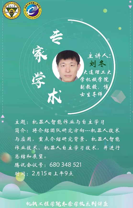 2月15日,来自大连理工大学的刘冬副教授为机械工程学院的同学们带来了一场别开生面的讲座,围绕着机器人智能作业以及自主学习这个话题,深入浅出地介绍了机器人智能化在医学、装配、增材制造以及屠宰方面的原理和应用。讲座中同学们反应热烈,不断有新想法和新思路在碰撞。刘冬副教授介绍,机器人作业的环节是未来的主要增量,航空航天、3C电子、物流、新能源等行业刺激着工业机器人的发展,推动着其普及,是一场莫大的机遇,而在这基础之上,更需要机器人智能化、柔性化、易于操作使用。为了使同学们更加直观地理解这一点,刘冬副教授以机器人模拟人工剖切猪腹为例,这项工艺用点云分割和剖切点提取获得猪酮体形状,再根据预设的剖切点进行剖切,使得这项工作在保持效率的同时不至于摧残工人的身心。最后刘冬副教授提出,机器人智能作业与自主学习需要多模态感知继承精确识别和定位,能够快速泛化学习,适应复杂多变的环境和学习完成长时任务。