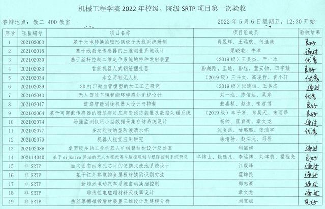 机械工程学院2022年校级、院级SRTP项目第一次验收于2022年5月6日12:30至15:00在本科教学楼进行。本次有19个项目参加现场验收,经过答辩评审老师认真评审,共有4个项目或优秀,6个项目获良好,9个项目获通过,现将验收结果公示如下。