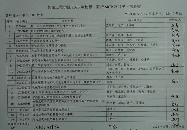 机械工程学院2022年校级、院级SRTP项目、2023年半年期项目,2023年第一次验收于202351712:401610在本科教学楼进行。