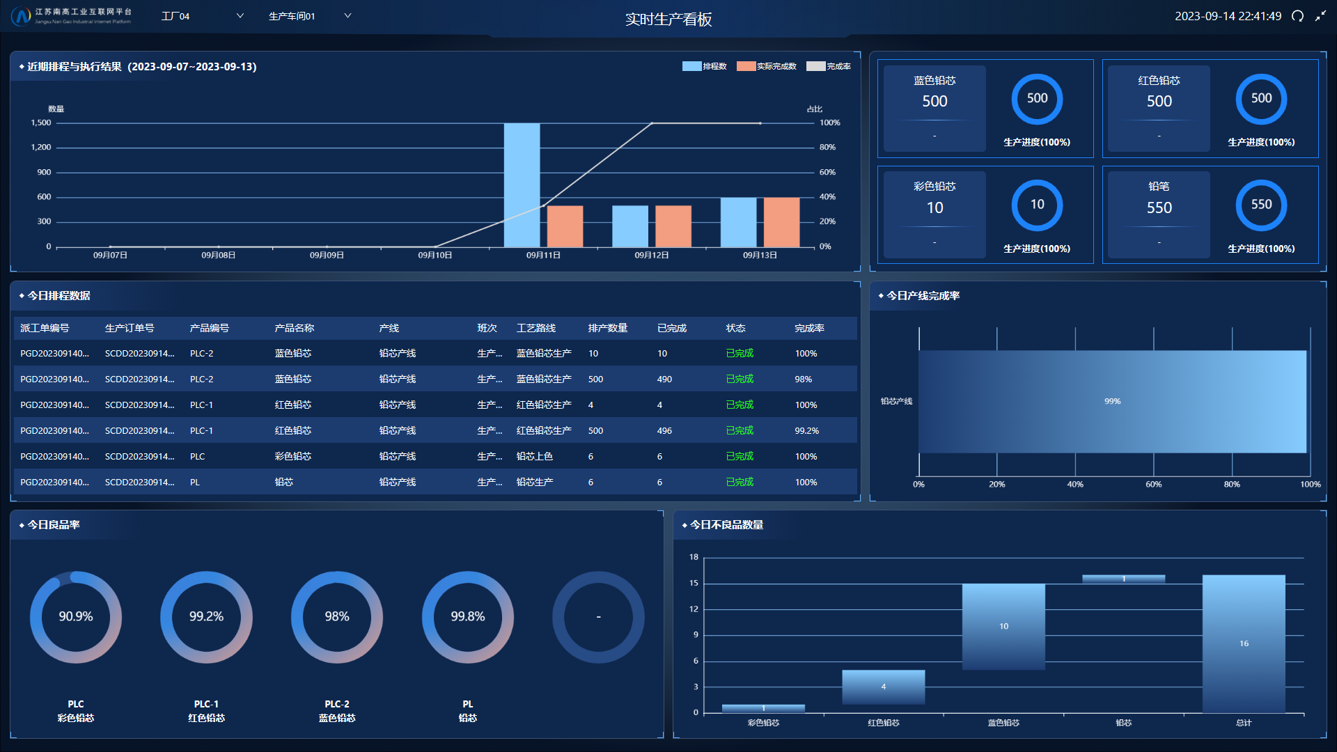 1.MES系统生产操作可视化数据。通过对南高智能制造管理系统(MES)的不同模块进行逐一设置,关联,确认;在生产订单模块下达任务后顺序进行,最终将流程结果显示在生产看板上,体现MES系统的便捷和性能。